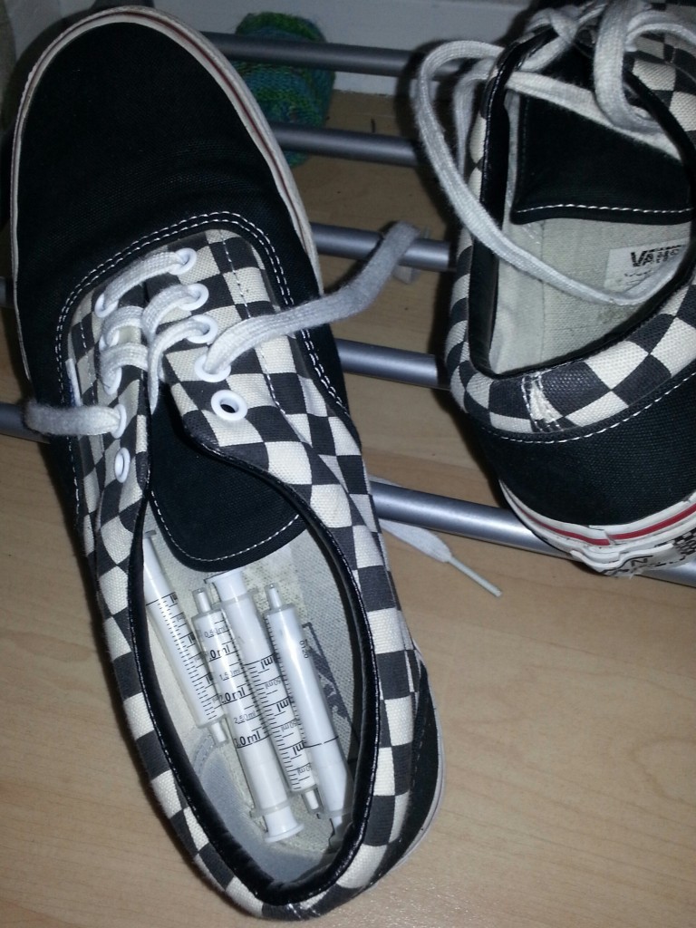 En annan sak som är vardag nu är mediciner. Två sprutor fylls med medicin två gånger om dagen. För Linus är de lika naturliga som att äta frukost. Mycket mer naturliga och välkomna än att borsta tänderna ;D Båda barnen leker gärna doktor och ger varandra sprutor. Och vi hittar dem lite var som…!