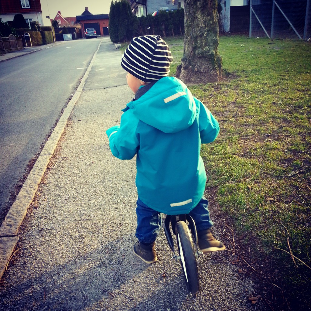 I somras fick Linus en springcykel. I vanlig ordning ratades nya äventyr och den har blivit stående. Senaste veckan har han velat testa några gånger, men blivit arg och ledsen efter några sekunder då han känt balansen svaja. Men så igår förstod han hur han skulle göra! Otroligt nöjd ”cyklade” han en lång runda i kvarteret. I snigelfart, men han fixade det. Yey! Nästa gång ska klart hjälmen på också, vem vet, det kanske blir tempo snart… 🙂