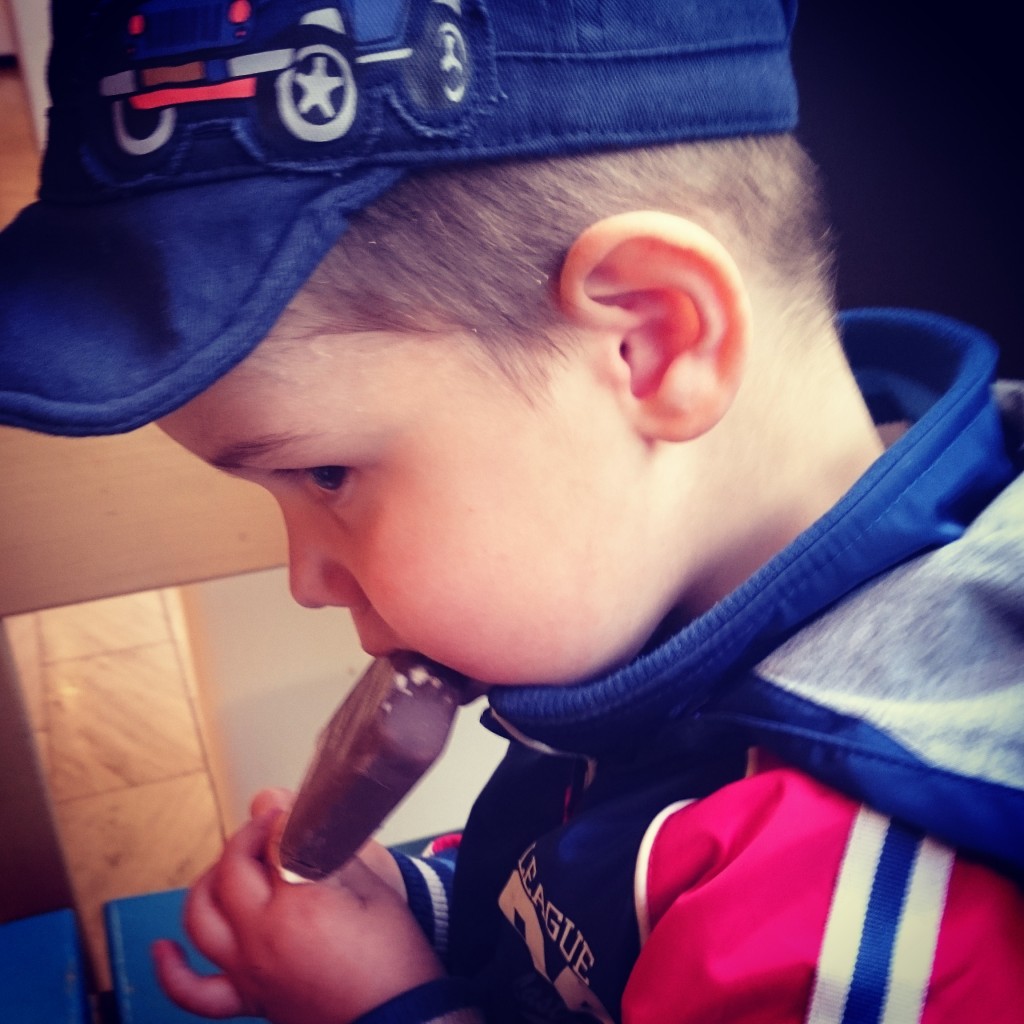 Sen tågade vi mot belöningen: Glass! Jag undrar vad all vårdpersonal tänkte som gick förbi. En pojke som gjort sig extremt värd en glass kl 8.40 eller oansvarig mamma som ger sitt lilla barn glass till frukost, haha! Sen kom dagens svåraste moment; att passera fontänen på sjukhusområdet. Att passera en fontän, pool eller hav utan att bada är för Linus lite svårt oacceptabelt. Våra förhandlingar strandade och vi lämnade scenen högljutt 😉
