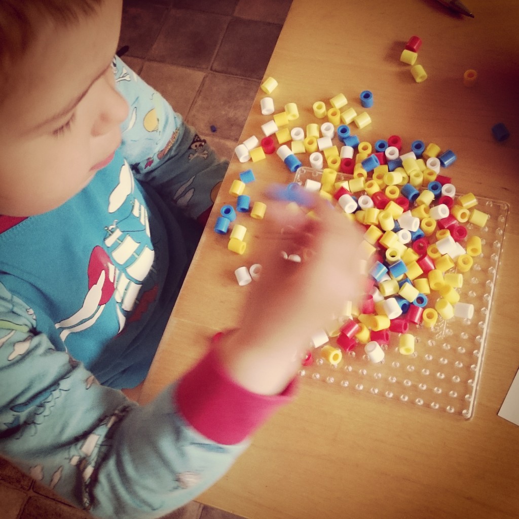 Vi lär oss mer och mer om hur vi måste tänka och agera för att undvika olika situationer. Det gäller att hela tiden ligga steget före. Vissa dagar är jag lugn och pedagogisk. Andra trött och tålamodstömd. Härom helgen blev jag lite nöjd med mig själv (man måste klappa sig själv på axeln ibland 😀 ). Linus ville pärla och jag ställde glatt fram burken och en platta till honom. Vände ryggen till och hör fem sekunder senare ljudet av hur burken vänds upp och ner, hur alla pärlor flyger ut i köket! Men jag lyckas trycka bort den minst sagt irriterade känslan. Inser att jag så klart skulle satt mig bredvid och gett honom pärlorna en efter en eller varit med när han plockade. Jag vet ju hur han fungerar. Så jag städade ihop allt och så började vi om, tillsammans.