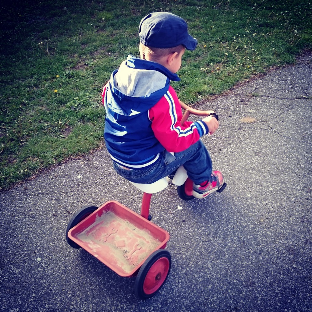 I början av veckan hände det, Linus satte upp fötterna på tramporna på trehjulingen och cyklade för första gången. Tjoho!! Det som alltid känts nytt och obehagligt. Ytterligare en seger!