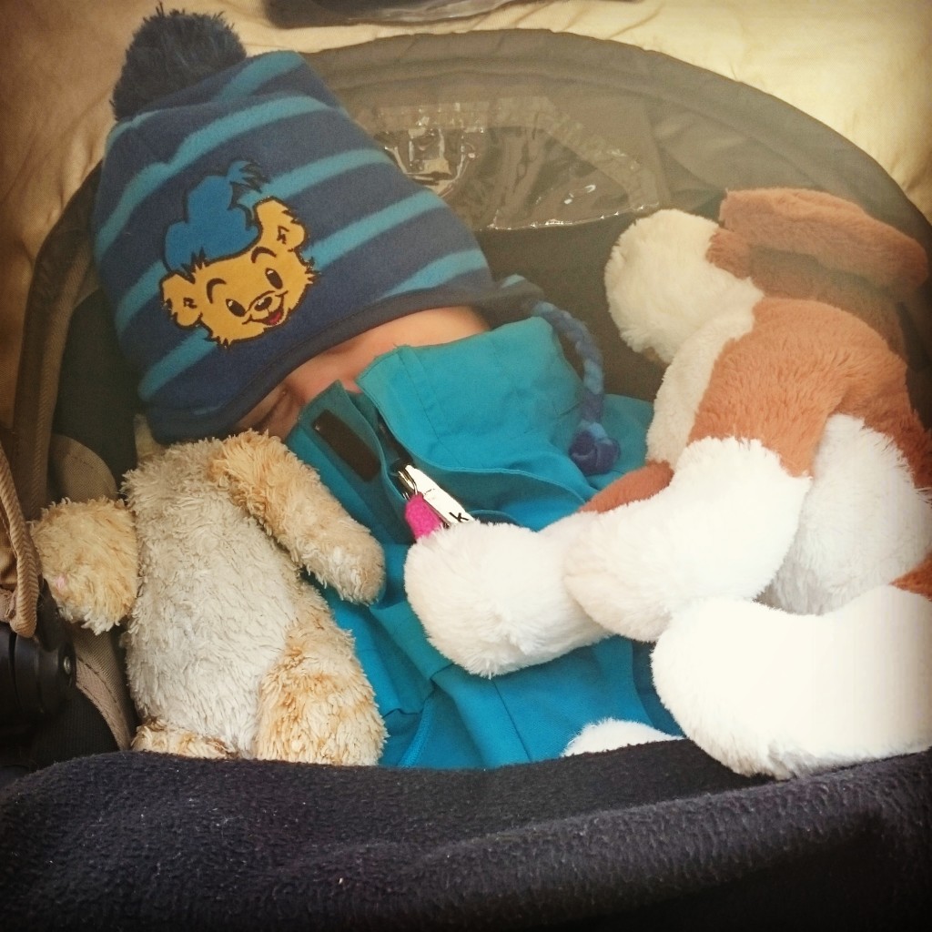 Det var tufft att bli väckt, så långt ifrån utsövd. Väl i vagnen somnade han om och sov säkert en timme. Sedan var det dags för den utlovade belöningen: Pannkakor! Jag var så stolt över hur bra han klarat allt idag, så jag struntade i sockerstoppet och gav honom en glasspinne till efterrätt. Han åt halva, sen var han nöjd 🙂 Han la sig i soffan framför TV:n. Jag nämnde väl i förbifarten typ ”Säg till om du vill sova mer” och DET ville han direkt! Så nu ligger han där uppe och sover medan hantverkaren hamrar i vårt badrum intill. Min älskade trötta superhjälte!