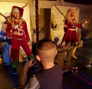Linus blev (så klart!) väldigt fascinerad över all elektronik, sladdar och strålkastare. När showen börjat kom han på att han ville ha en ballong (det fick man ju på showen på Lanzarote). Han klev in på scenen, harklade sig artigt och frågade om han kunde få en ballong några gånger under föreställningen, haha! Det var så skönt där. Linus får vara precis som han är. Jag kände inte alls att jag var tvungen att få honom att ”anpassa sig” till några regler (förutom att inte koppla bort några sladdar). Jag känner mig då mycket lugnare. När han fått godis av tomten sprang han plötsligt tillbaka på eget initiativ och bad om en påse till Hannah också. Han verkade ha roligt och det gick kanonbra för det var med rätt förutsättningar. Och det allra bästa – när festen var slut fick han DRA UT SLADDARNA TILL STRÅLKASTARNA och leka med sladdarna till högtalarna!