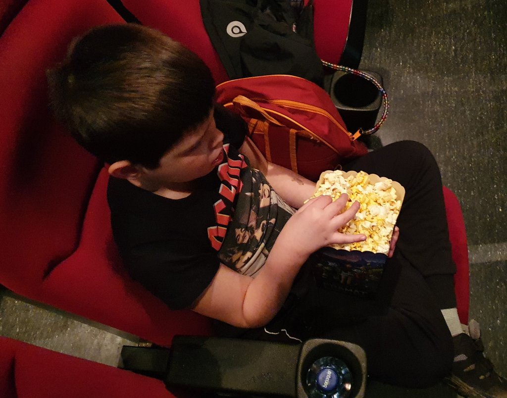 Filmen var rolig. Linus skrattar ju så härligt och innerligt åt det mesta så i början skrattade han konstant och kommenterade högt allt tokigt . Sen märkte jag att han började bli trött och lite rastlös. Han började gunga fram och tillbaka som han alltid gör hemma i soffan. Det lugnar honom. Men efter 45 minuter var han klar. Han ville bara ut och i det läget diskuterar jag inte. Han hade varit så duktig, haft roligt och kände sig klar. Succé! Vi promenerade hem i solen med vår fulla popcornbytta 🥰