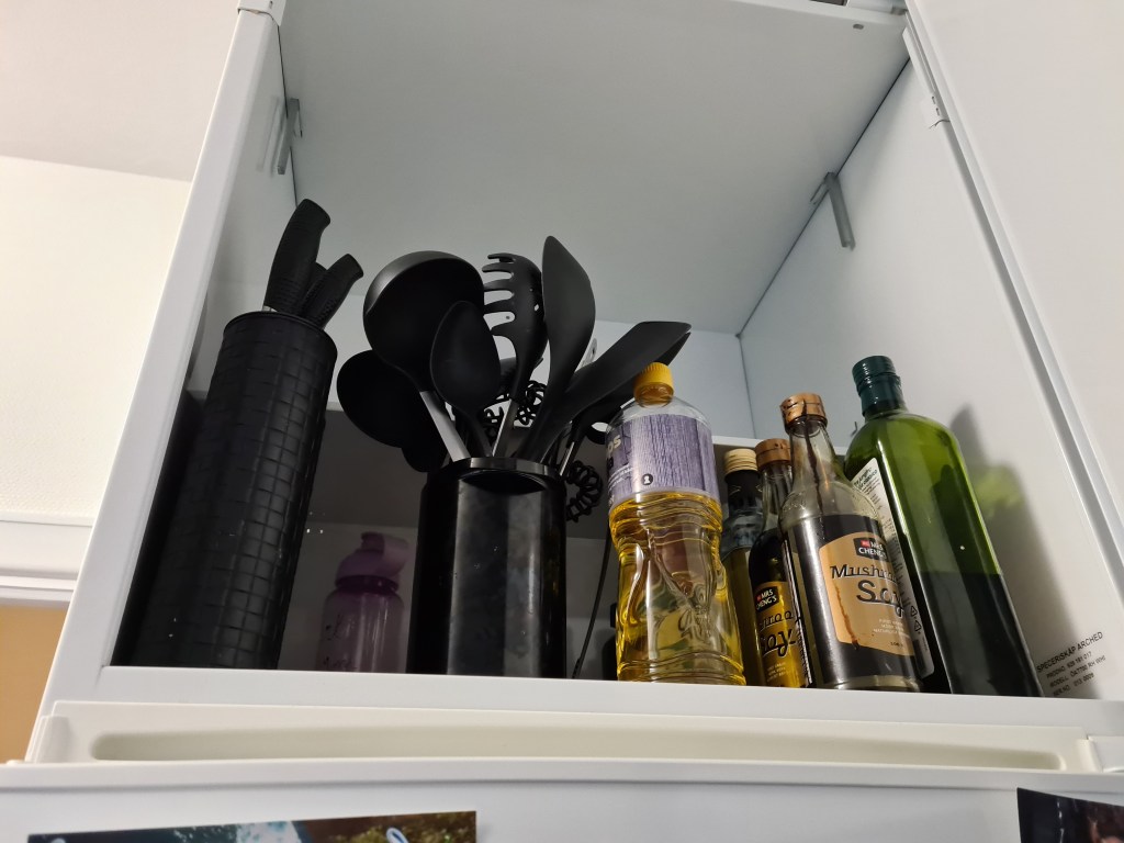 Slevar och vispar – upp i ett högt skåp.