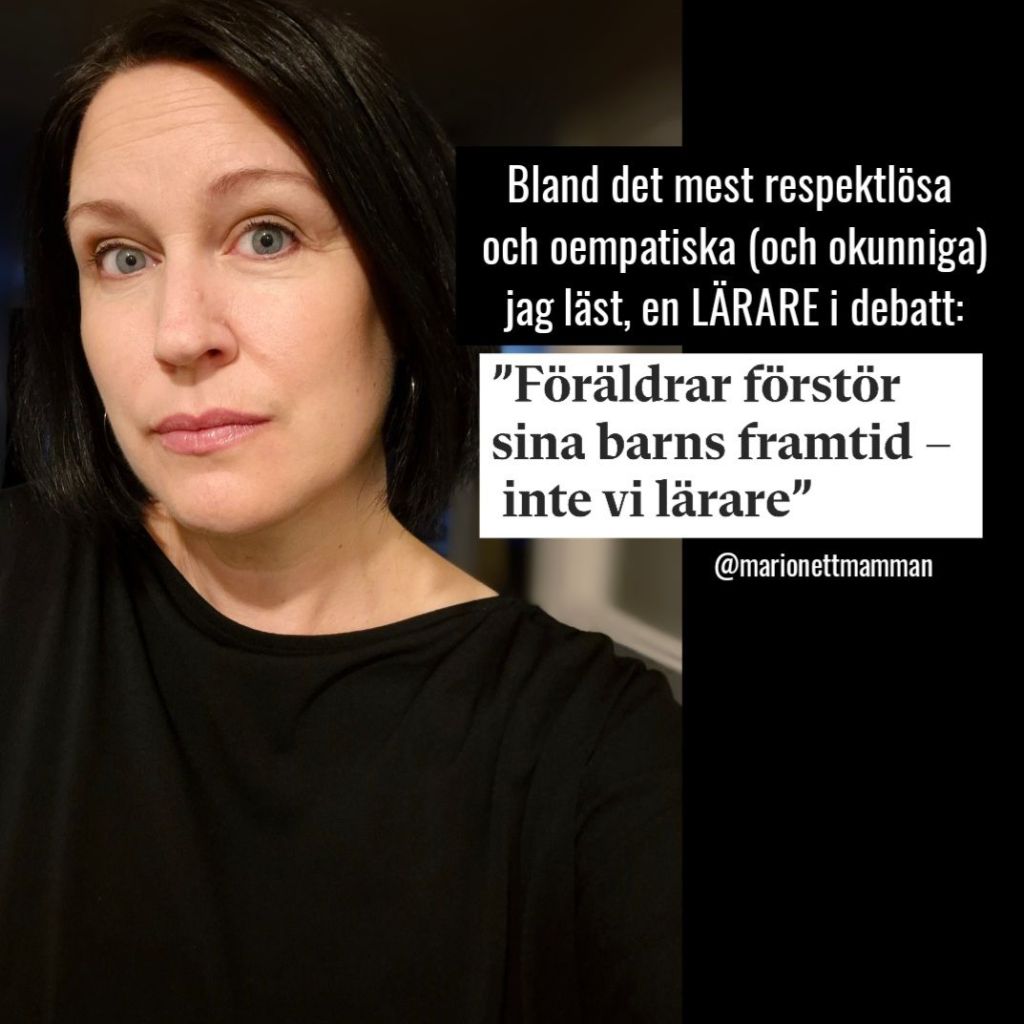 I ett debattinlägg hos Vi lärare skriver läraren Ulrica Björkblom Agah ”Någon måste säga det: Det är föräldrarna som förstör sina barns framtid – inte lärarna”. Alltså redan där… Man kan ha en så fast synpunkt för hög eller låg skatt. Men detta handlar inte om en konkret politisk detalj. Detta handlar om BARN som mår psykiskt dåligt och om familjer i kris. Jag anser att det är extremt oempatiskt att då raljera och dra alla över en kam med ett så respektlöst ogrundat uttalande.
